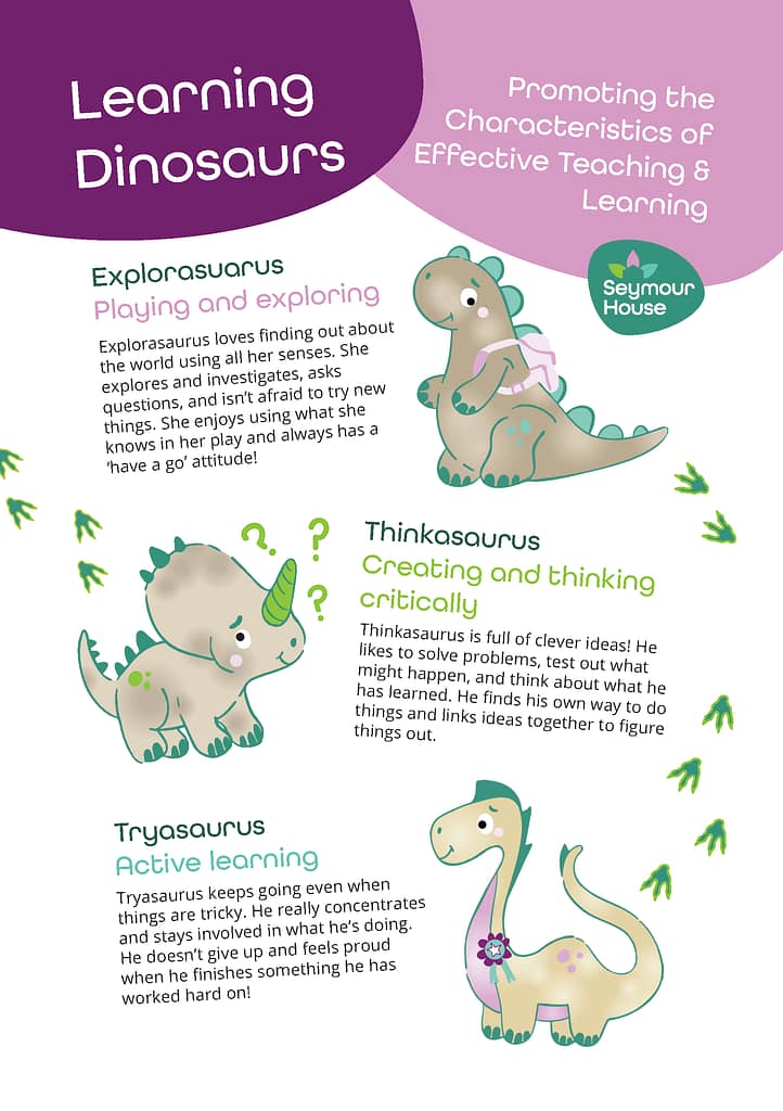 Our Learning Dinosaurs help raise awareness of the different ways children learn, thinking about how they engage with others and interact with their environment. Based on the characteristics of effective teaching and learning, our dinosaurs promote a growth mindset and positive attitudes toward learning. We love using our three friendly Learning Dinosaurs – Explorasaurus, Tryasaurus, and Thinkasaurus as part of our fun-filled nursery days.